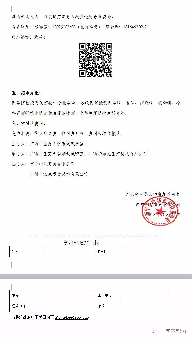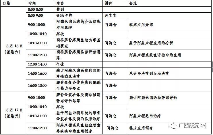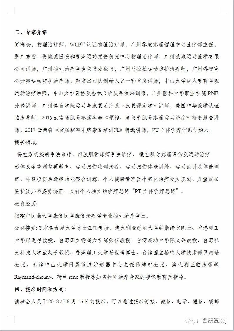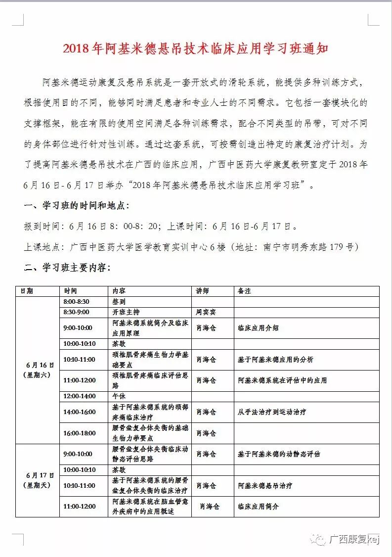 康复知识,专家论坛, 设备信息,技术交流 在高价的学习班满天飞的今日, 你是否还在为参加哪个学习班而苦恼? 学哪些技术才能用到工作上呢? 不用纠结 现在 免费学习 阿基米德悬吊技术 理论+实操演示 学习颈、肩、腰和骨盆疼痛 的悬吊技术与临床应用 提高你的悬吊技术水平 多一种治疗的方法和思路 阿基米德运动康复及悬吊系统是一套开放式的滑轮系统,能提供多种训练方式,根据使用目的不同,能够同时满足患者和专业人士的不同需求。它包括一套模块化的支撑框架,能在有限的使用空间满足各种训练需求,配合不同类型的吊带,可对不同的身体部位进行针对性训练。通过这套系统,可按需创造出特定的康复治疗计划。 为了提高阿基米德悬吊技术在广西的临床应用,广西中医药大学康复教研室定于2018年6月16日- 6月17日举办“2018年阿基米德悬吊技术临床应用学习班”。 一、时间和地点: 报到时间:6月16日8:00-8:20; 上课时间:6月16日(周六)-6月17日(周日) 上课地点:广西中医药大学医学教育实训中心6楼(地址:南宁市明秀东路179号) 二、课程表: 三、专家介绍 脊柱系统疾病手法诊疗、四肢肌骨疼痛手法诊疗、 慢性肌骨疼痛评估及运动治疗 形体及姿势调整再教育、运动损伤物理治疗、运动损伤体能训练、运动设计及体能训练、神经损伤后遗症功能整合训练、个人健康管理及个案化治疗处方规划、儿童成长监护及异常姿势矫正、具有个人独立的诊疗思路“PT立体诊疗思路”。 四、报名时间和方式: 请参会人员于2018年6月15日前报名,可以通过微信、电话、短信或报名链接形式报名,以便确定参会人数并进行会务安排。 会务联系: 李彩诺:18076382503(柏钰会务) 阳老师:18154522092 扫描二维码报名参加学习班 长按二维码 报名参加学习班 不要错过 五、招生对象: 医学院校康复医疗技术专业学生,各级医院康复医学科、骨科、疼痛科、推拿科、全科医师等执业医师和康复治疗师、个体康复医疗爱好者等。 六、费用: 学习班通知 柏钰会务(扫描二维码添加咨询和报名) 推荐酒店: 双人间:198元/晚 含早 主办方:广西中医药大学康复教研室 承办方:广西中医药大学康复教研室 广西康尔健医疗科技有限公司 协办方:南宁柏钰商贸有限公司 广州市派康运动医学有限公司 运动康复治疗及悬吊系统——阿基米德康复系统训练实例 使用对角线模式来增加“核心稳定肌群”力量 ·可以通过使用弹力带和滑轮进行肌力和协调性训练。 被动颈椎牵引和腰椎自我牵引 ·牵引可在坐立位或仰卧位进行,也可进行腰椎的牵引。 四肢、脊柱、躯干和身体的姿势性训练肌力练习 ·这些动作可在仰卧位或俯卧位完成,这些训练的目的是改善患者手术后的活动性、神经肌肉协调和肌力。 肌力练习 ·练习可在任何姿势下以任意方向完成,同时可通过配合使用弹力带或重量工具增加训练负荷。此外,还可在直立姿势下维持平衡的同时募集更多肌群的参与。 运动治疗及悬吊系统临床适用范围: 各种运动疾病的康复、骨科病人、风湿病人、神经损伤病人 悬吊治疗训练可提供: 完全去重或部分减重训练 悬吊治疗的适应症: 下背痛 风湿报名联系人: