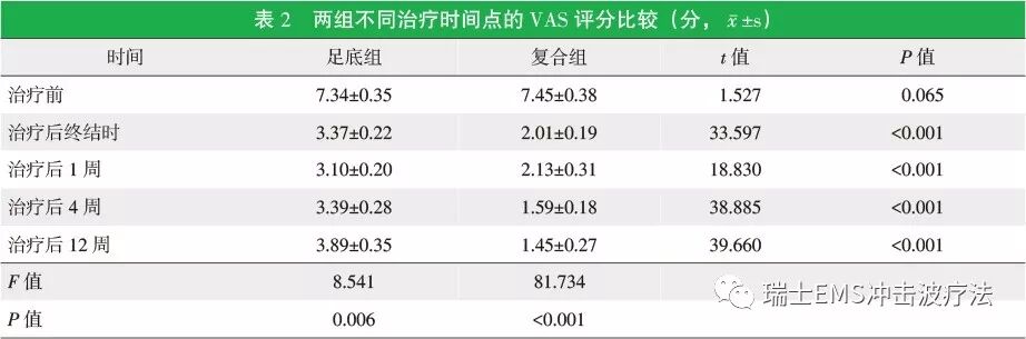 两组在治疗前VAS评分差异无统计学意义(P>0.05)。两组在治疗终结时,治疗后1、4、12周VAS评分较治疗前均明显降低,尤以复合组显著(P<0.05)。复合组在治疗后各时间点VAS评分与足底组比较更低,差异有统计学意义(P<0.05),详见表 2。