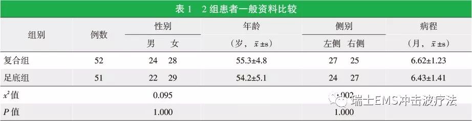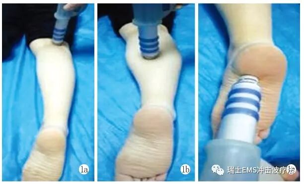 冲击波治疗:采用瑞士EMS公司生产的SwissDolorClast型发散式冲击波治疗仪在标记处进行治疗,局部涂抹耦合剂,冲击波治疗探头贴紧皮肤,能流密度为0.12~0.20mJ/mm2,每次冲击2000次。(治疗方案①足底筋膜区2000次;治疗方案②足底筋膜区及小腿三头肌区共2000次)。放散式冲击波治疗每5天1次,共治疗4次。